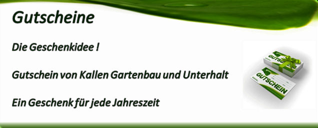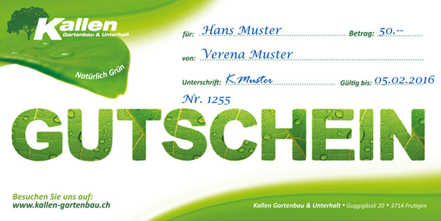 Kaufen Sie jetzt neu die Geschenk Gutscheine von Kallen Garten und Unterhalt. Sie können frei wählen wie hoch der Betrag sein soll. Der Gutschein ist einlösbar für jegliche Arbeiten von Kallen Gartenbau und Unterhalt.